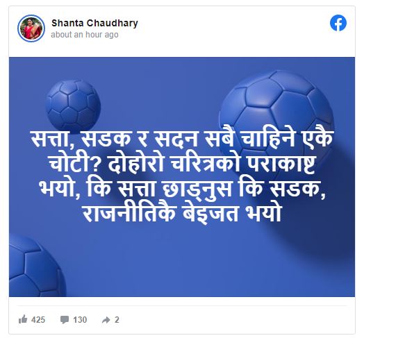 सामाजिक सञ्जाल फेसबूकमा लेख्दै उनले सत्ता, सडक र सदन सबै एकैचोटी चाहिने भन्दै प्रश्न समेत गरेकी छन् । माओवादी केन्द्र र एकीकृत समाजवादीको नाम उल्लेख नगरी चौधरीले यस्तो लेखेकी हुन् ।