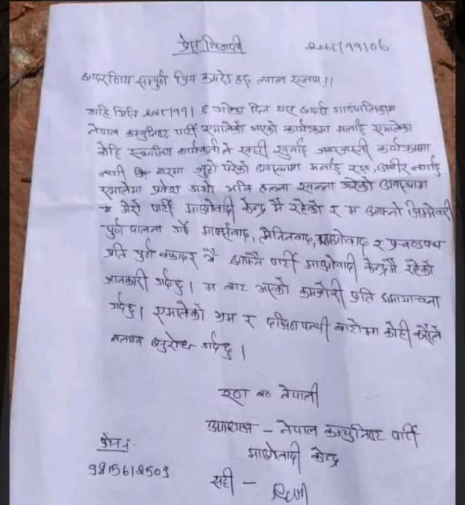 ६ फागुनमा आदर्श गाउँपालिकामा एमालेको कार्यक्रममा आफूलाई एमालेका कार्यकर्ताले रक्सी खुवाइ एमाले प्रवेश गराएको नेता नेपालीले गत शनिबार जारी गरेको विज्ञप्तिमा उल्लेख गरिएको छ ।
