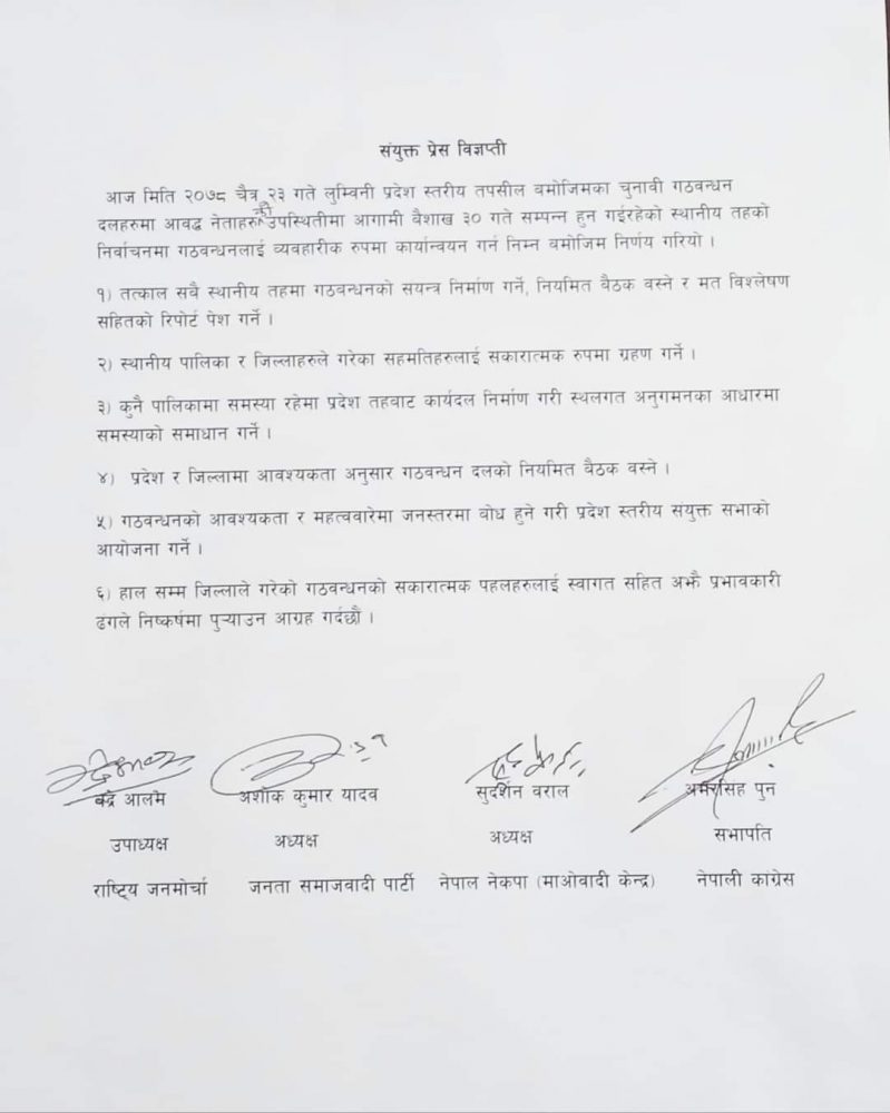 बुटवल – सत्ता गठबन्धनले निर्वाचनमा तालमेल गरेर जाने बताए पनि लुम्बिनी प्रदेशमा भने एकीकृत समाजवादी बाहेकको गठबन्धन गरिएको छ ।