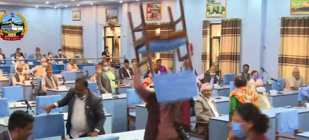 प्रदेश नं. ५ को राजधानी तोक्ने विषयमा विवाद बढेपछि नेताहरू संसद भवनभित्रै तोडफोडमा उत्रिएका छन् । सोमबार बसेको प्रदेशसभा बैठकमा तोडफोड भएको छ ।