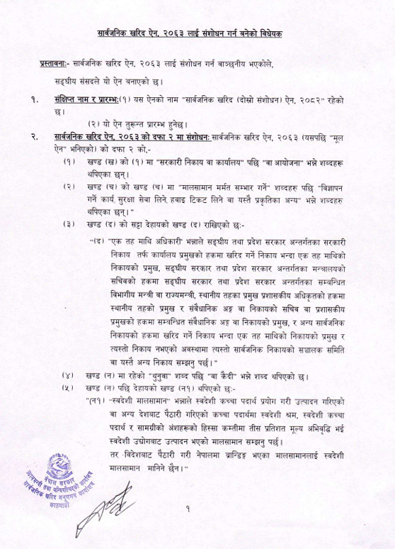 सार्वजनिक खरिद अनुगमनको कार्यालयले ‘सार्वजनिक खरिद ऐन संशोधन विधेयक’ को प्रारम्भिक मस्यौदा तयार पारेको छ ।