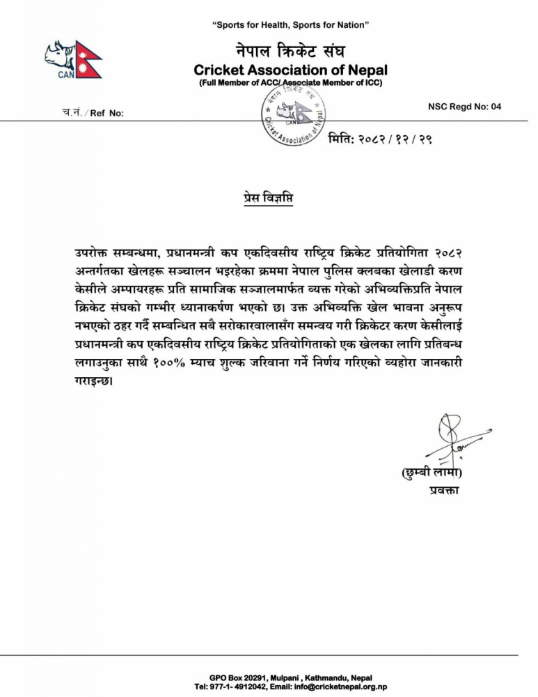 काठमाडौँ । विवादित स्ट्याटसलाई लिएर क्रिकेटर करण केसी कारवाहीमा परेका छन् । उनलाई नेपाल क्रिकेट संघ (क्यान) ले एक म्याच प्रतिबन्ध तथा म्याच फी काट्ने निर्णय लिएको छ ।