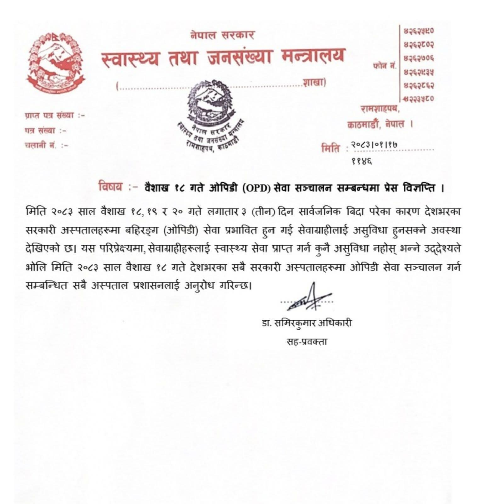 मन्त्रालयका सह-प्रवक्ता डा. समिरकुमार अधिकारीले जारी गरेको सूचनामा लगातार तीन दिन सार्वजनिक बिदा पर्ने अवस्थाका कारण नियमित ओपिडी सेवा प्रभावित हुने सम्भावना रहेकाले सेवाग्राहीलाई पर्न सक्ने असुविधा न्यूनीकरण गर्ने उद्देश्यले यो निर्णय गरिएको उल्लेख छ ।