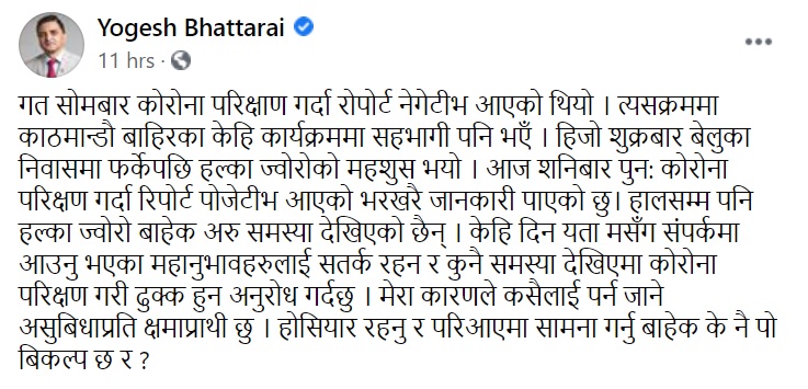 शुक्रबार बेलुकी आफूलाई ज्वरो आएपछि स्वाब दिएको र त्यस क्रममा शनिबार रिपोर्ट कोभिड १९ पोजिटिभ आएको उनले उल्लेख गरेका छन् । ‘हालसम्म हल्का ज्वरो बाहेक अरु समस्या देखिएको छैन,’ उनले पोस्टमा भनेका छन् ।