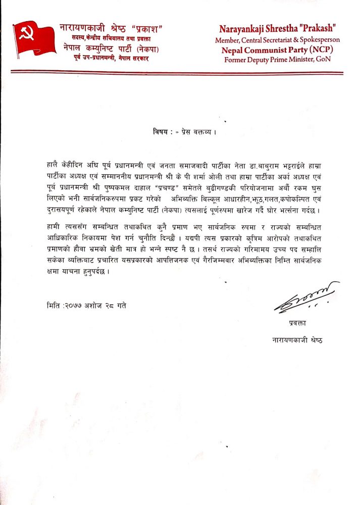 पार्टीका दुईअध्यक्षको नाम जोडेर गम्भीर आरोप लगाएपछि नेकपा प्रवक्ता नारायणकाजी श्रेष्ठले एक विज्ञप्ति जारी गर्दै उक्त आरोप खारेजसमेत गरेको छ । यदि त्यससँग सम्बन्धित तथाकथित कुनै प्रमाण भए सार्वजनीक गर्न पनि प्रवक्ता श्रेष्ठले चुनौती दिएका छन्।