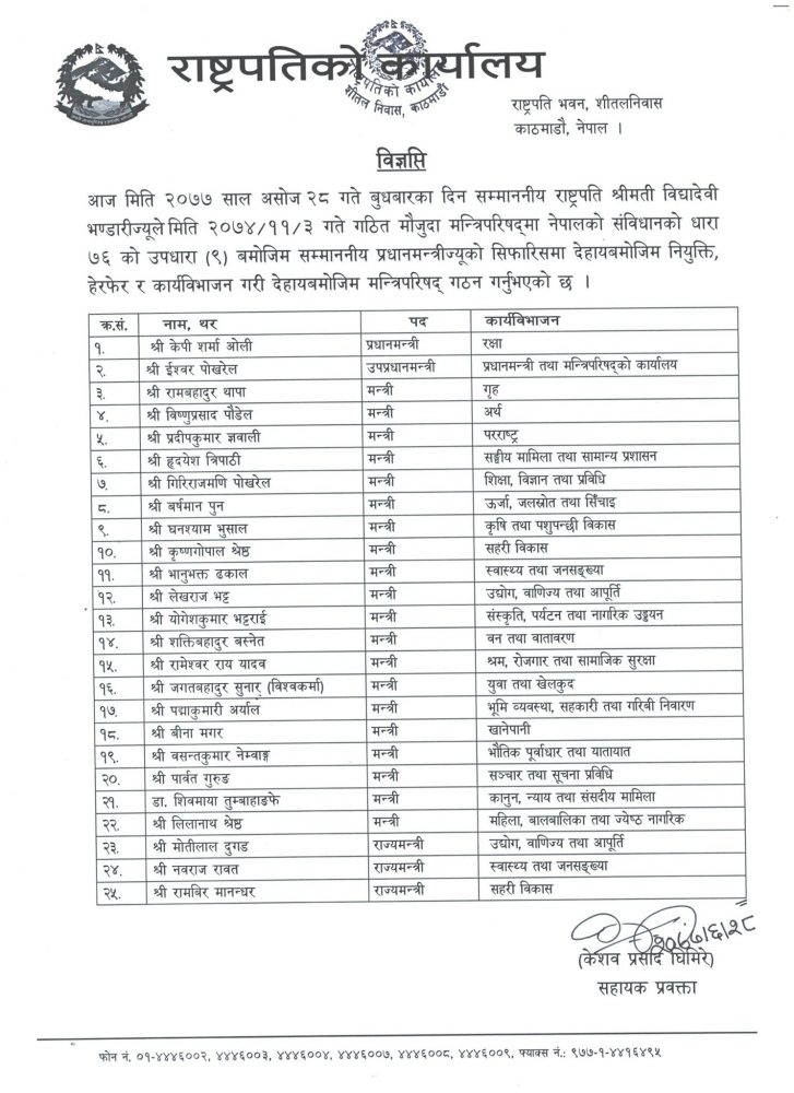 त्यस्तै प्रधानमन्त्री केपी शर्मा ओलीले रक्षामन्त्रालय आफू मातहत राखेका छन्।